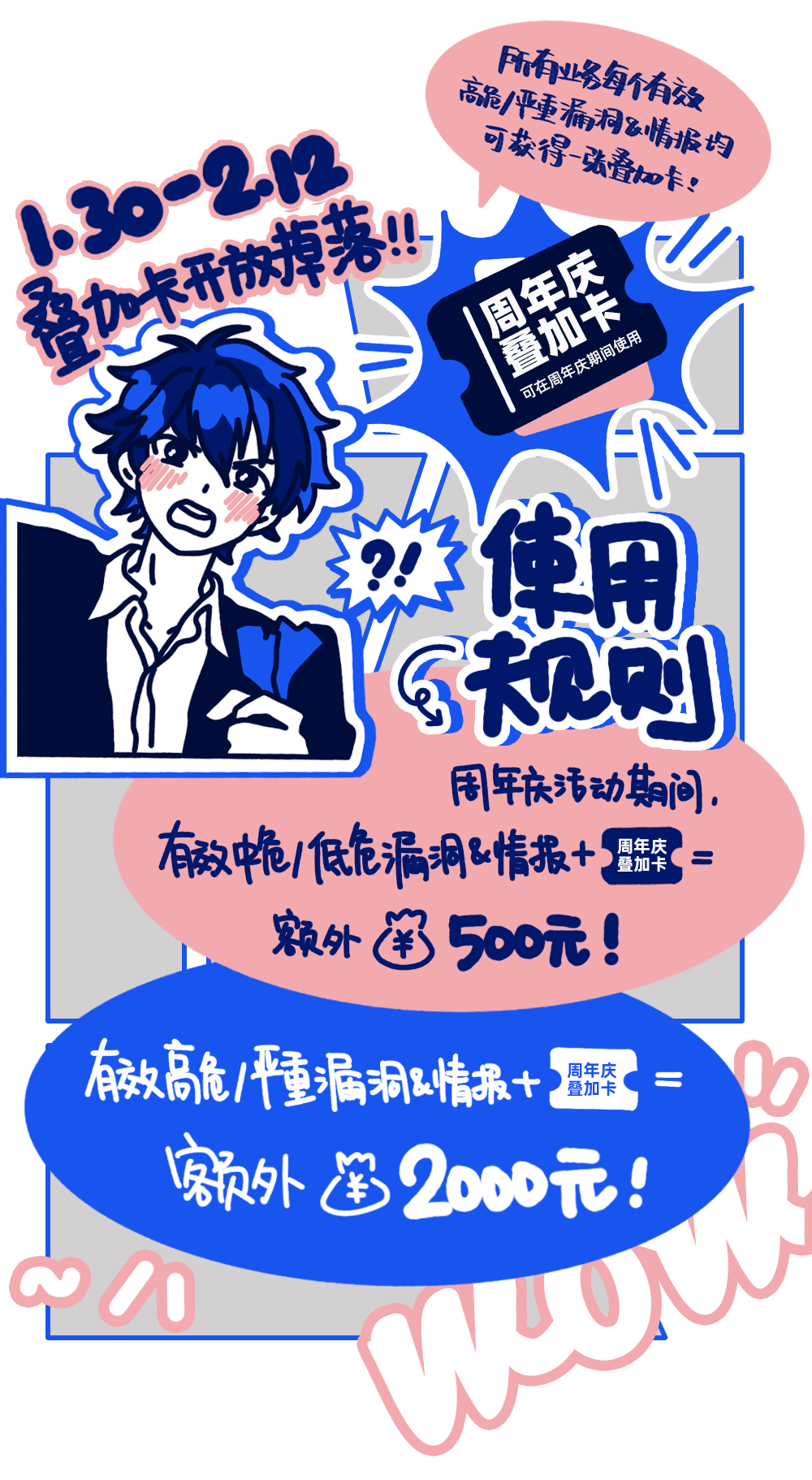 本次活动期间,所有业务每个有效高危/严重漏洞&情报均可获得一张陌陌SRC周年庆额外奖金叠加卡!具体使用规则见下: