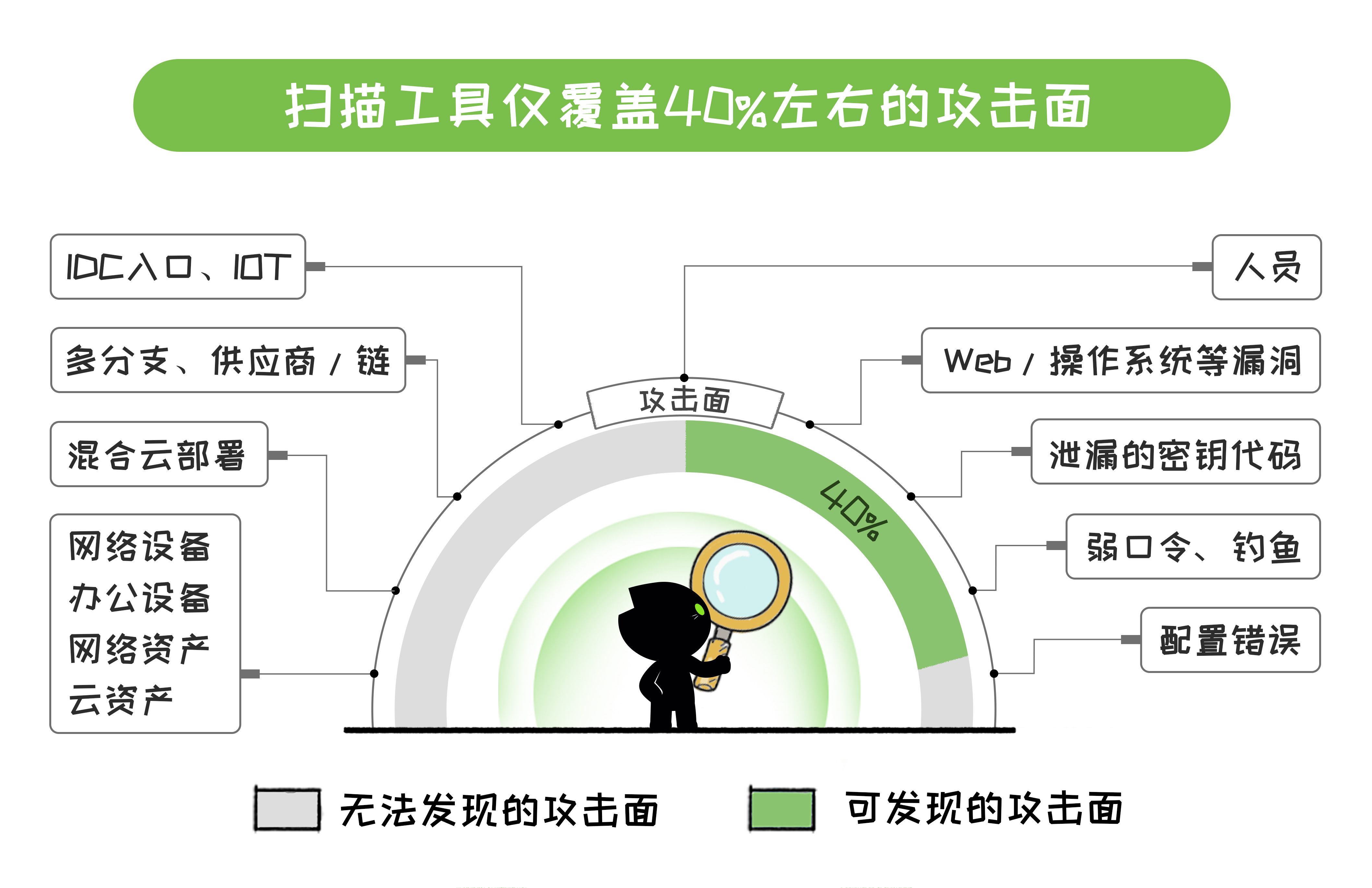 【证书、⼦域、IP、公共云服务错误配置、SaaS应用、泄露的代码、暴露的数据库、可被攻击者利⽤的漏洞】等等未知资产与风险