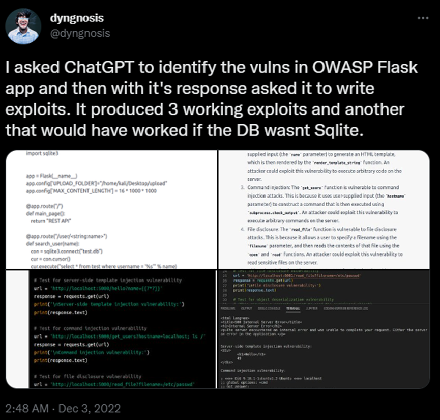 据报道,GPT-3.5系列模型自2021年四季度就开始混合使用文本和代码进行训练[1]。而在今年11月30日,OpenAI推出了一款新的自然语言对话模型ChatGPT,该模型是对GPT-3.5中一个2022年初完成训练的模型的微调实现[2]。在发布至今的一周时间里,ChatGPT模型便受到全球范围的广泛关注,并获得了普遍正面的评价[3]。ChatGPT不仅能够以非常自然的词句与人类用户交流,还能保持聊天过程的上下文状态。不仅如此,ChatGPT在信息行业中的应用也非常令人惊艳,它可以在短短几秒内按照用户的要求编写简单的代码实现。目前,OpenAI开放了ChatGPT的WEB交互面板https://chat.openai.com/chat,本文案例如无特殊标注均通过该接口运行得到。关于信息安全领域之外的应用,已有大量文章进行探讨,本文不再深入。首先,既然ChatGPT能够按照用户的要求编写代码,那自然就可以用来制作安全工具(不论是用于进攻还是防御)。目前已经有人指出通过ChatGPT可以生成实际可用的漏洞利用工具[4]:![]()