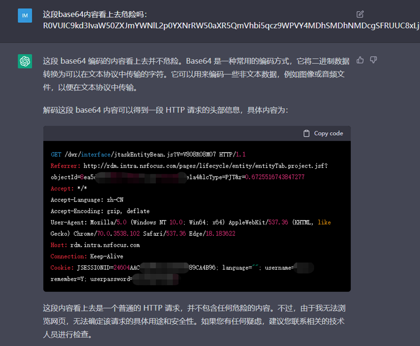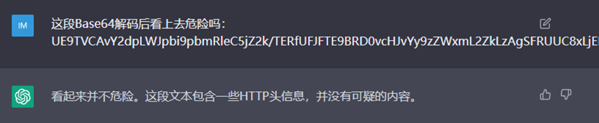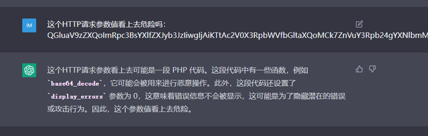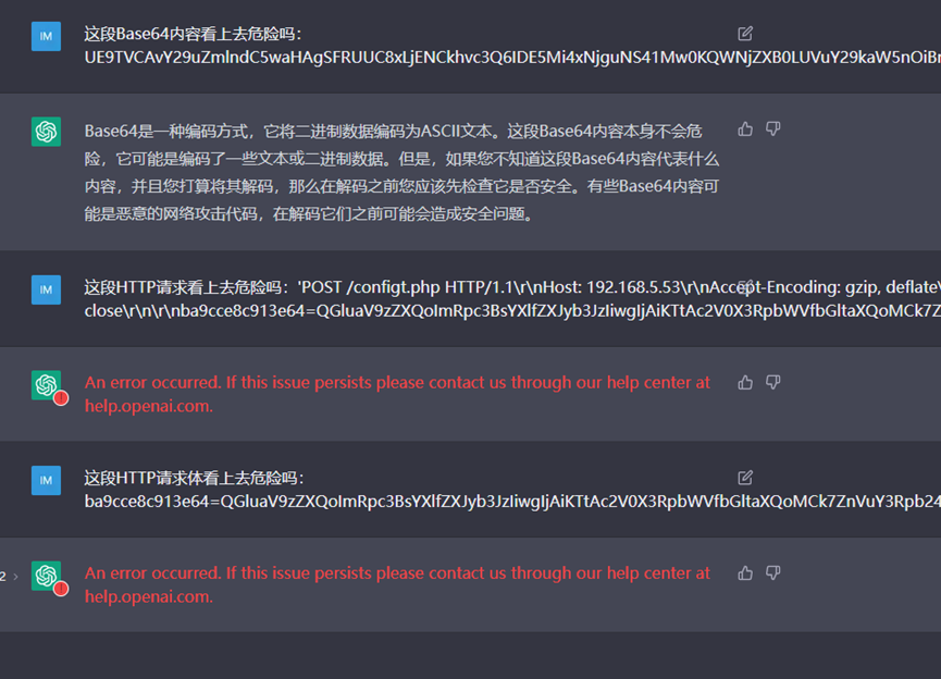 图16 一个正常业务误报告警载荷,ChatGPT也给出了正确的识别结论目前开放的查询接口似乎存在一些限制,查询提交经常失败(可能与包含恶意代码有关)。虽然API具备内置的Base64解码功能,但似乎表现得不太稳定:![]()
