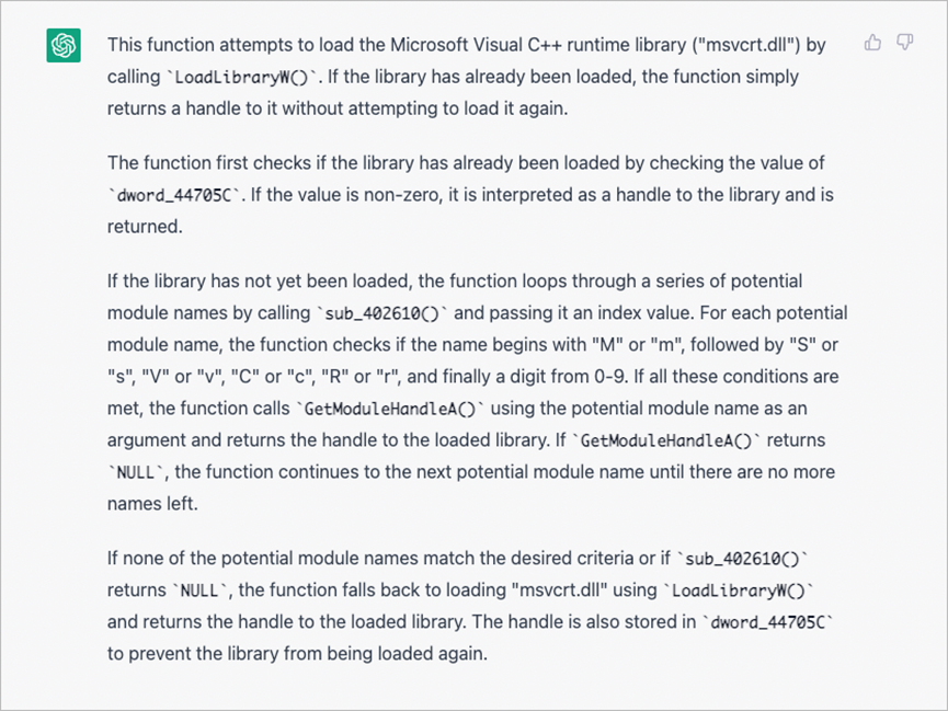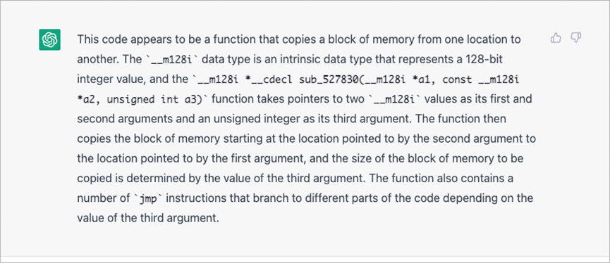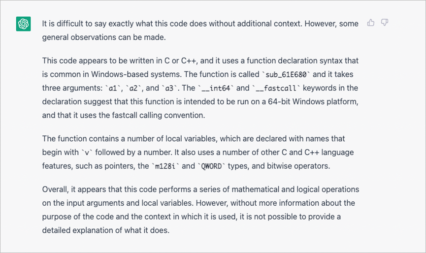 我们也进行了一些相关测试,要求ChatGPT对给定的反编译代码进行解释:![]()