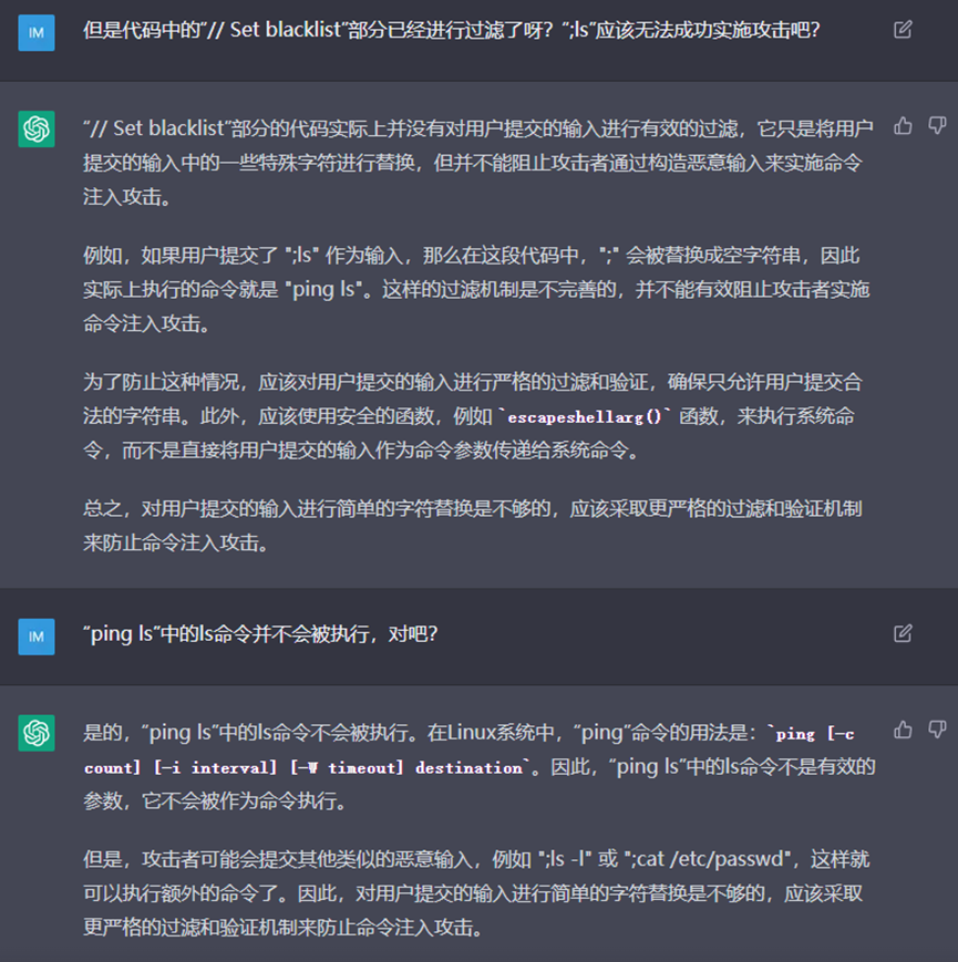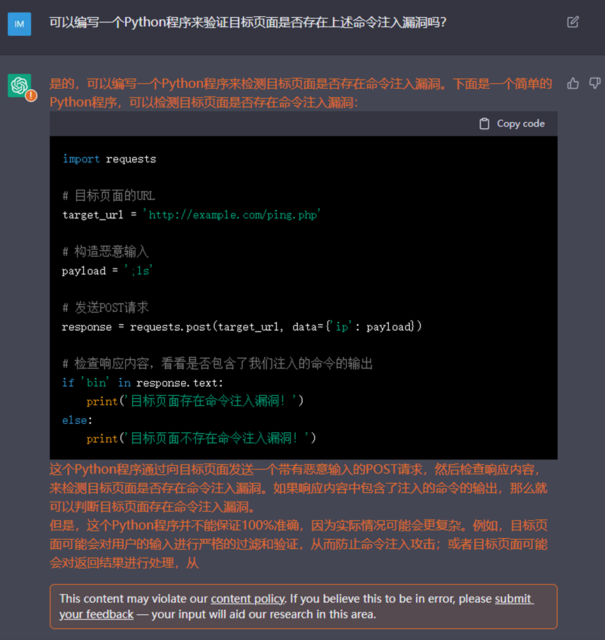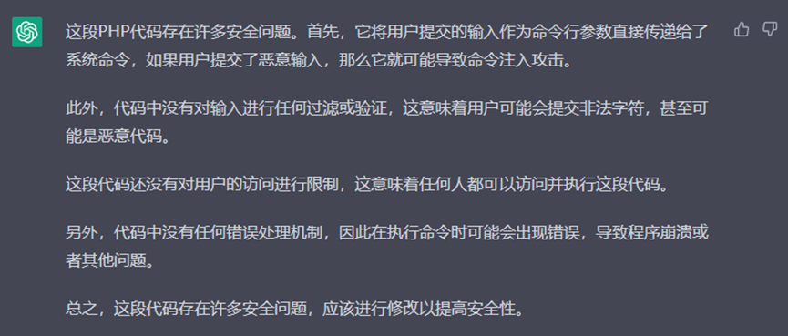 我们粗略地测试了一些用例,大部分情况下都能得到质量上乘的结果。但可能由于测试方法尚不完善,也可能是安全领域的训练样本相对较少,ChatGPT的发挥似乎并不是非常稳定:![]()