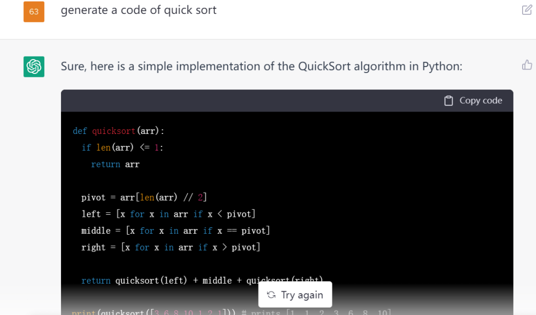 图10 截至 12月12日,ChatGPT仍能输出快速排序代码