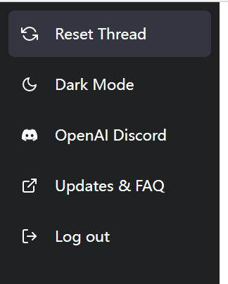 上述的5个功能分别为:重置线程、深色/浅色模式切换、OpenAI站点链接、更新与帮助、登出,其中重置线程这一功能相对特殊。由于ChatGPT会根据上文语境回答后续问题,因此用户需要通过重置线程这一功能来清楚语境中已有的信息。