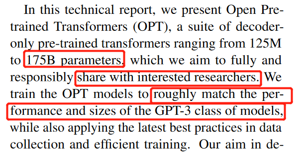 图5 OPT项目论文中提到项目以分享给感兴趣的研究者为目的,并能达到媲美GPT-3类模型的效果,引用自[3]