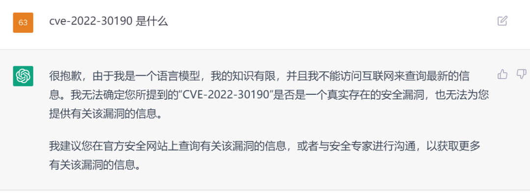 图16 ChatGPT不具备2022年CVE的相关知识且无法联网查询