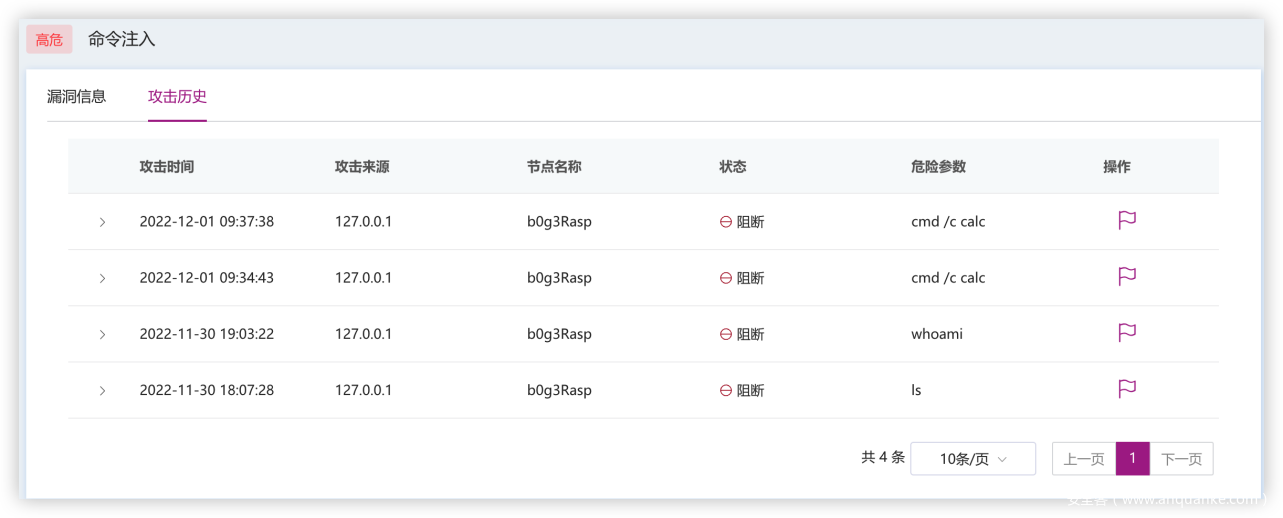 1. 根据URL对应的业务模块以及RASP策略命中的危险参数来判断攻击者是在进行攻击前尝试还是正在进行实际攻击,如图1所示: