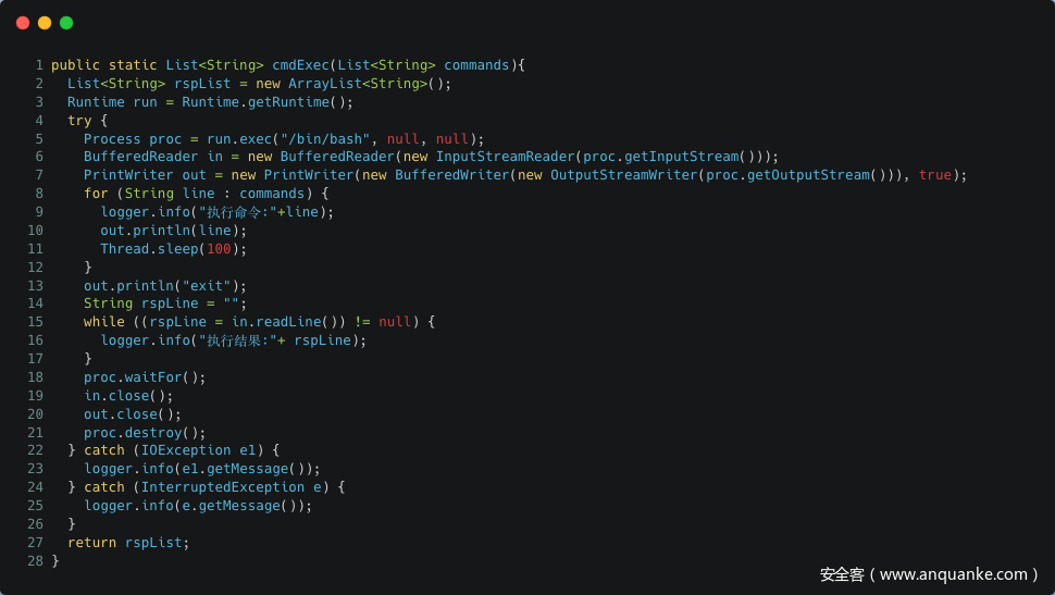 例如下述代码中,因为业务需要,应用程序需要接收用户输入来执行一些命令,但是在编写代码时却没有以白名单的形式来控制可执行命令的范围。
