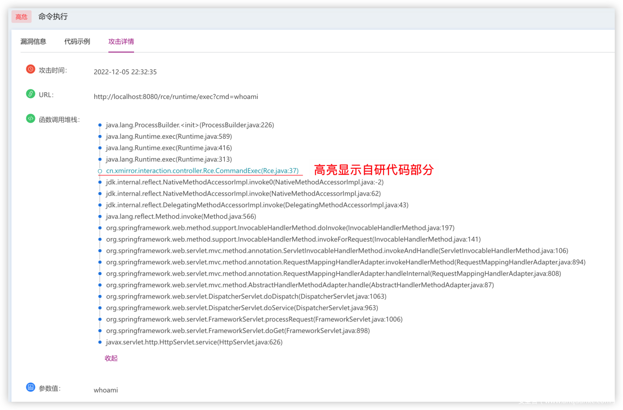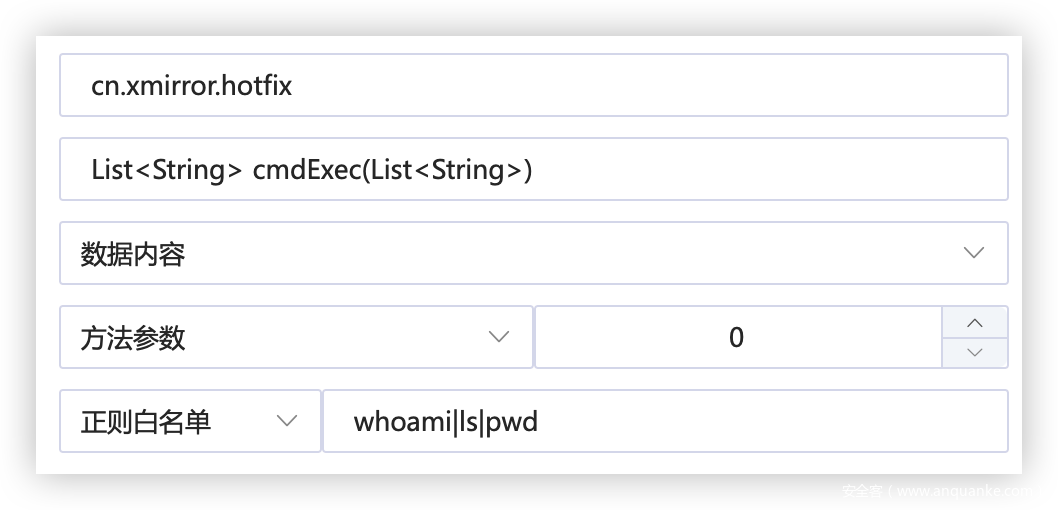这时,就可以通过RASP应用热修复对方法入参进行判断,不允许白名单以外的命令被执行: