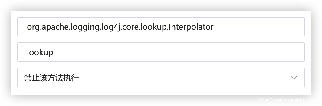 例如CVE-2021-44228 Log4j2远程代码执行漏洞,其主要原因是lookup错误处理了${jndi://}数据,导致了远程代码执行的风险。这种情况下,可以直接根据RASP获得的代码调用栈信息,直接拦截此方法。