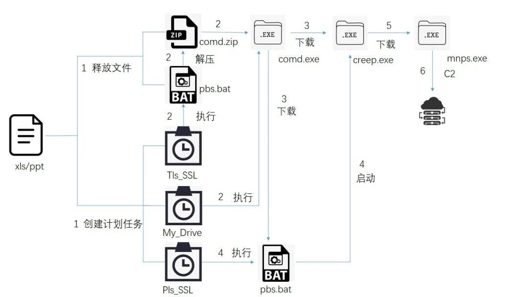 APT-C-35(肚脑虫)组织使用PPT或者XLS文档作为攻击载体,当受害者打开恶意文档时,会立即释放一个压缩包文件和批处理文件,并创建3个定时任务。其中Tls_SSL计划任务每隔4分钟执行批处理文件,批处理文件主要作用是将释放的压缩包进行解压操作,得到恶意可执行文件comd.exe,并删除Tls_SSL计划任务。My_Drive计划任务是定时执行comd.exe,comd.exe负责继续下载下一阶段载荷,同时下载一个批处理脚本作为Pls_SSL计划任务的启动项从而启动下载的载荷,载荷的主要功能为下载远控模块mnps.exe,从而实现恶意活动。[阅读原文]