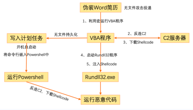 步骤1~步骤5:属于无文件投递阶段,黑客向目标投递了一个看似正常的Word文件,Word中的宏仅仅是一个加载Shellcode的loader,实际的Shellcode是在loader运行时才反连C2下载,这是非常典型的利用反射加载手法实现的无文件投递。整个过程中没有新的恶意文件写盘,且Shellcode也只会驻留在内存中,不会写盘,所以,到目前为止杀软都检测不到,更不会告警。