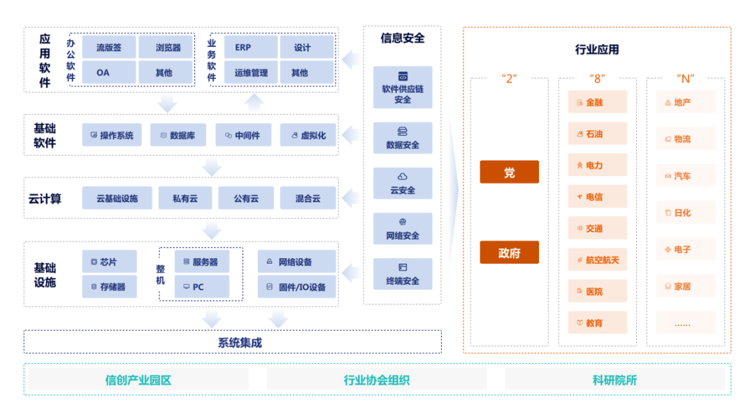 信创产业,即信息技术应用创新产业,是我国 IT 产业发展升级采取的长期计划。信创建设从党政试点,关键行业逐步推广(2+8+N),逐步建立自主的 IT 底层架构和标准,实现全IT全产业链实力和结构的优化升级,主要包含IT基础设施、基础软件、应用软件和信息安全等板块。