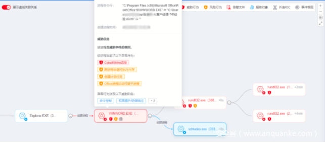 首先,EDR检测到Word简历启动后,Office进程利用宏启动了一个名叫Rundll32的系统可信程序,这是绝好的伪装;