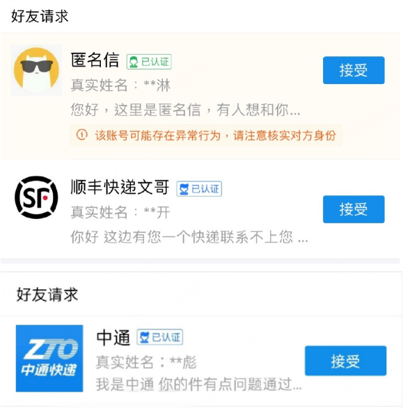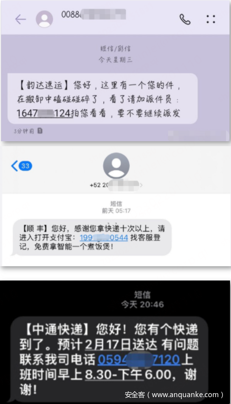 第一,冒充快递员,声称“xx快递”“送错件”“派件出现问题”或“联系不上”等,添加用户支付宝好友。