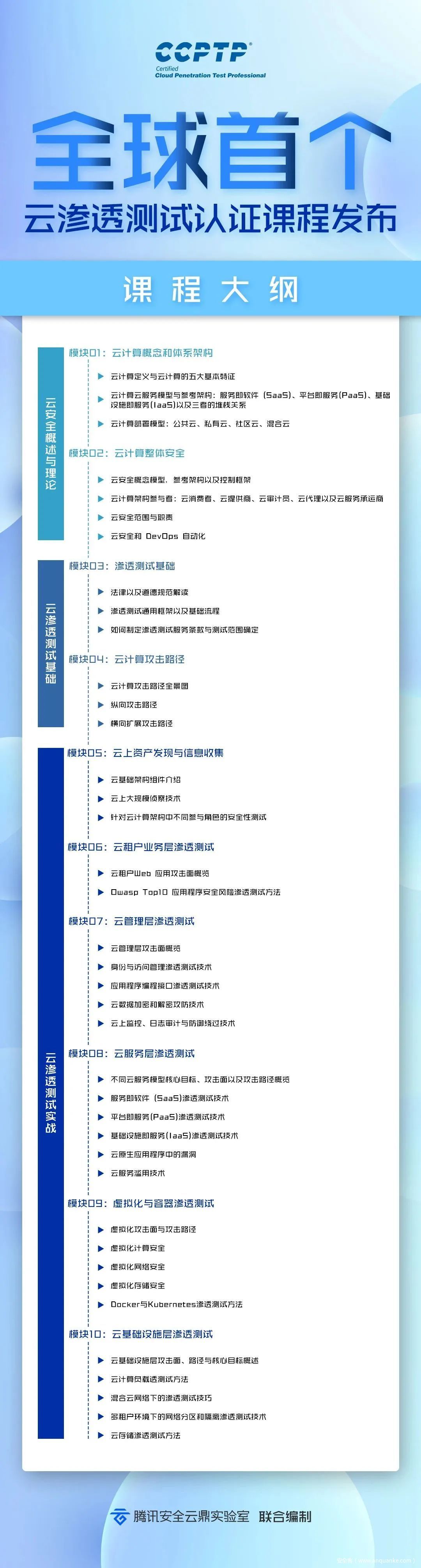 2月20日,国际云安全联盟CSA发布了“云渗透测试认证专家CCPTP”课程体系,这是全球首个云渗透测试能力培养课程及人才认证项目,有效地弥补了云渗透测试认知的差距和技能人才培养的空白。腾讯安全在该项目中担任核心课程编撰单位。