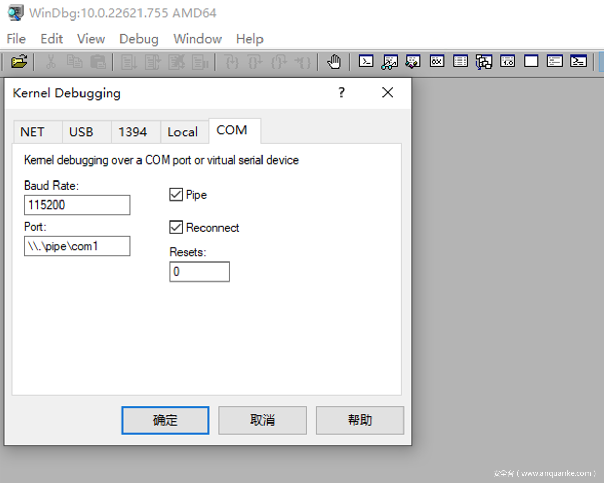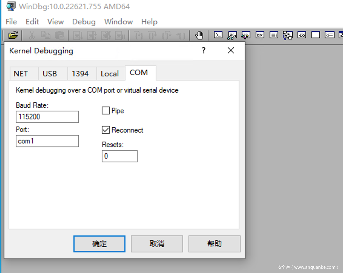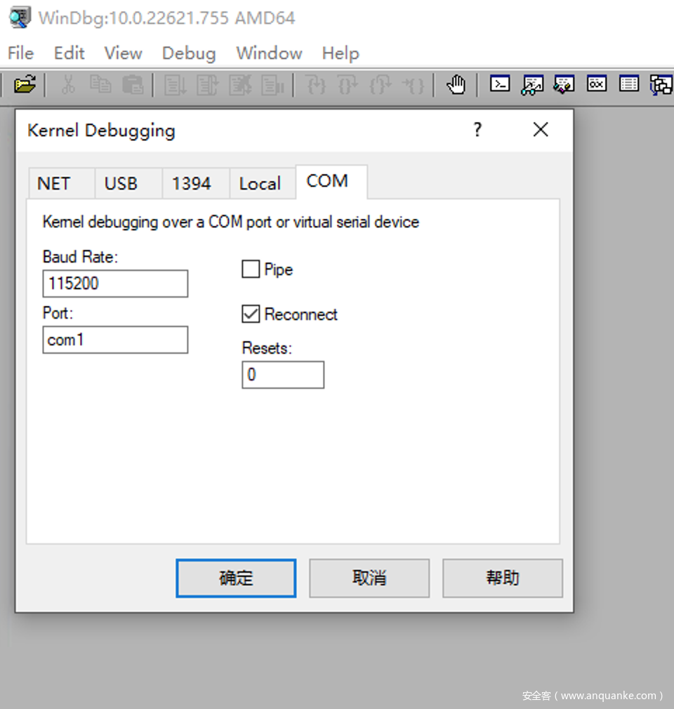 随后我们切换至调试机(debuger)下,使用 WinDBG 设置串口调试配置,波特率为 115200,端口为 1,不勾选 pipe,勾选 reconnect,如下: