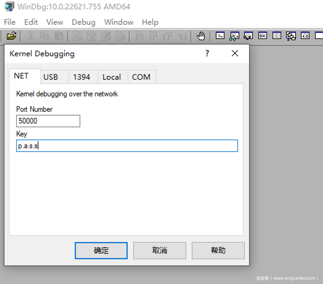 完成配置后重启生效;随即我们在调试机(debuger) 使用 WinDBG 进行网络调试配置,端口号为 50000,密钥为 p.a.s.s,如下: