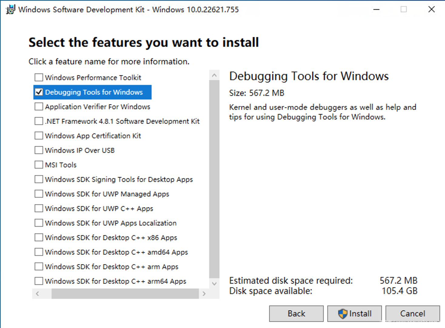 我们从官网下载 WinDBG 并在 windows10 系统上进行安装: