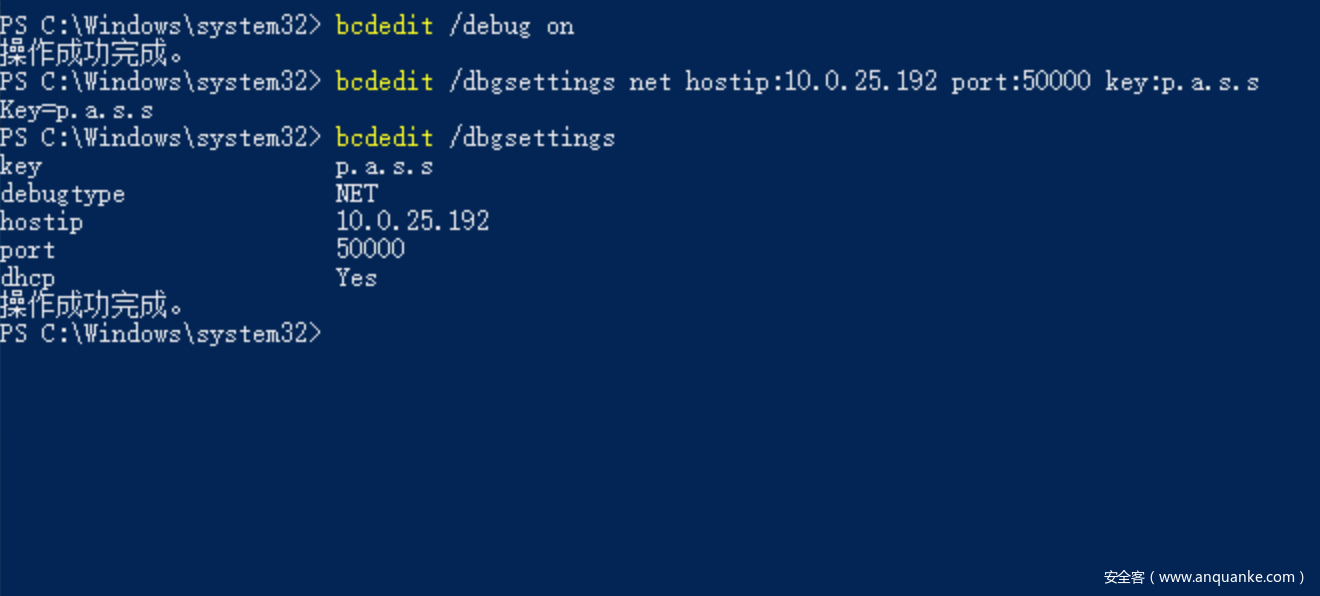 $ bcdedit /dbgsettings NET HOSTIP:10.0.25.192 PORT:50000 KEY:p.a.s.s