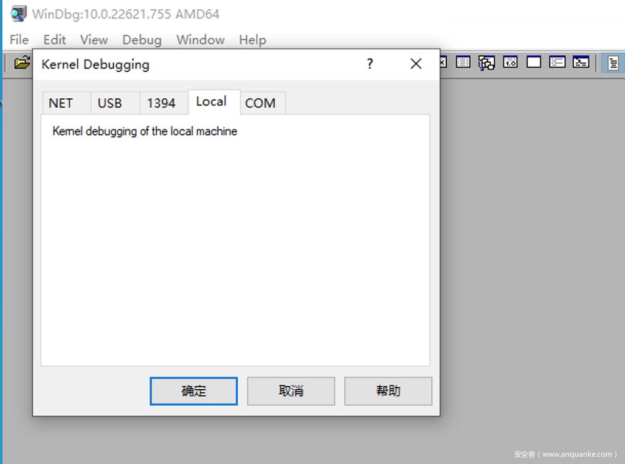 随后重启 windows10 虚拟机生效配置,使用管理员权限启动 WinDBG,选择 File - Kernel Debug,选择 Local 本地调试标签: