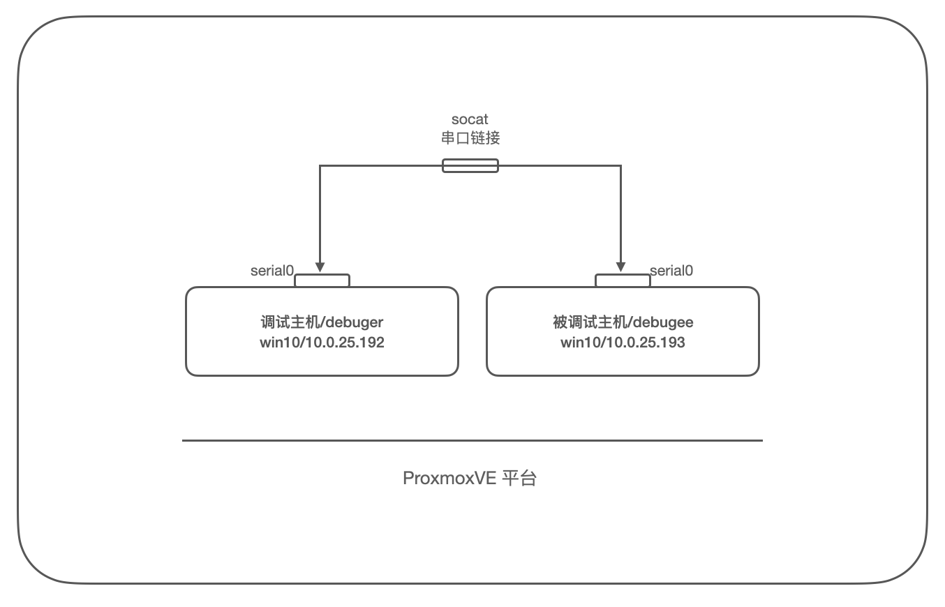 那么我们需要在 ProxmoxVE 再添加一台 windows10 虚拟机作为被调试机(debugee),以我们上文本地内核调试中的主机作为调试机(debuger),以此用两台虚拟机组成 windows 网络双机调试的环境,如下: