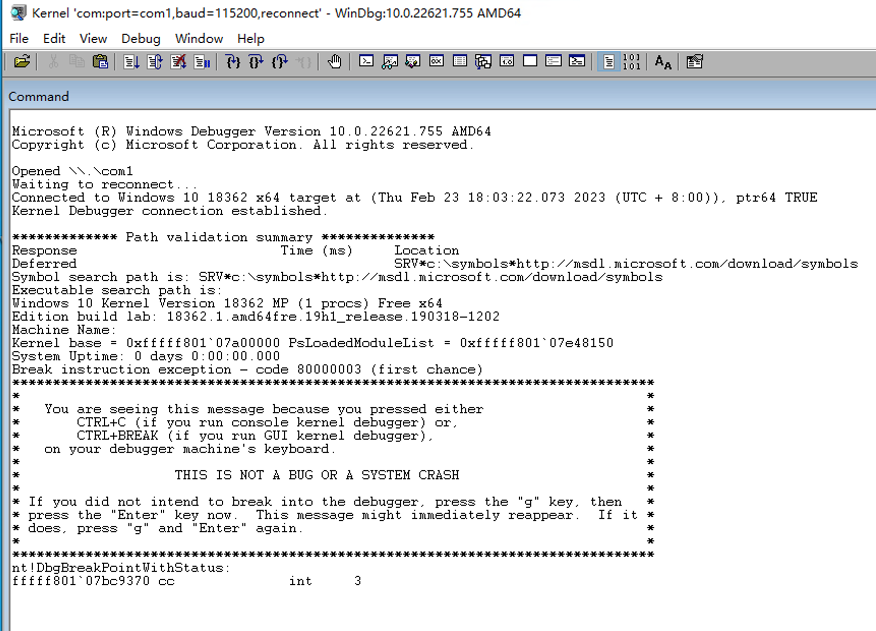 设置完毕后,在 WinDBG 显示 Waiting to reconnect... 后,重启被调试机(debugee),调试机(debuger)将在其系统启动时连接上去,使用 break 可将其断下来,如下: