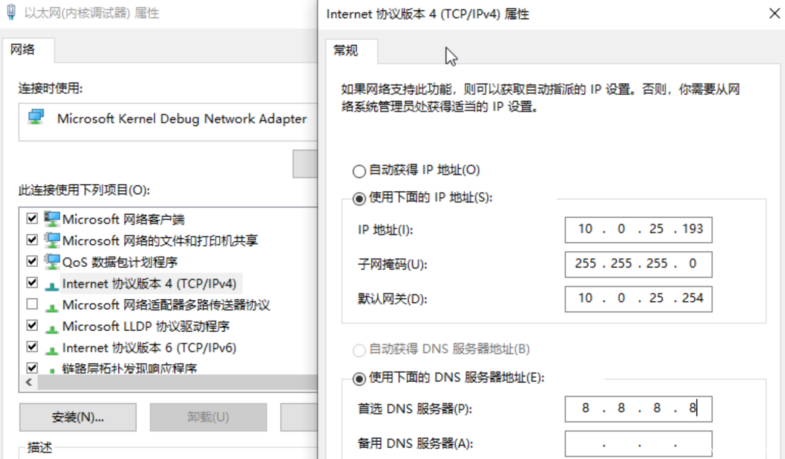 如果采用静态地址分配,则进入虚拟机后,在 以太网(内核调试器) 上配置静态地址即可,联网和网络调试不会冲突,都可以正常使用: