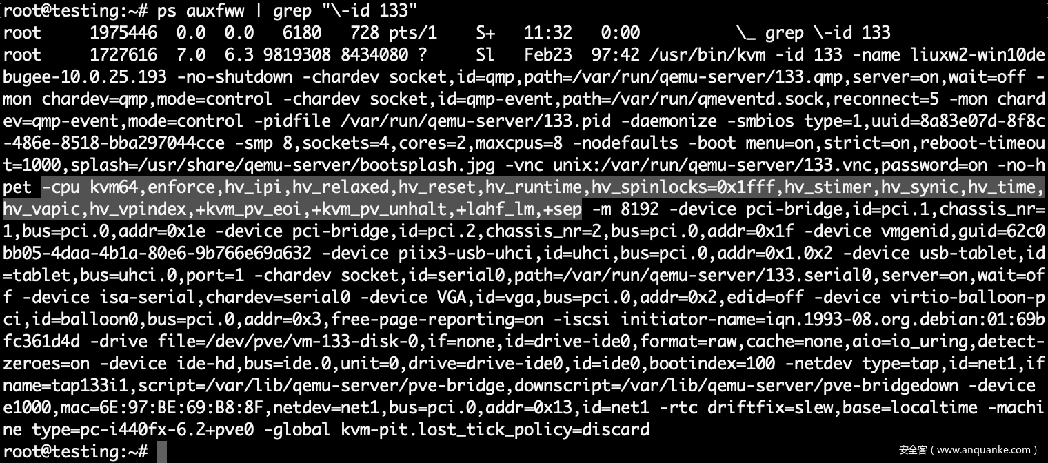 我们可以看到其 cpu 参数为 -cpu kvm64,enforce,hv_ipi,hv_relaxed,hv_reset,hv_runtime,hv_spinlocks=0x1fff,hv_stimer,hv_synic,hv_time,hv_vapic,hv_vpindex,+kvm_pv_eoi,+kvm_pv_unhalt,+lahf_lm,+sep,其中 hv_* 的配置表示 kvm 将以 hyper-v 的方式提供虚拟化功能,windws 虚拟机将认为自己运行在 hyper-v 的技术之上,以便使用 hyper-v 的功能并在一定程度上提高运行性能。
