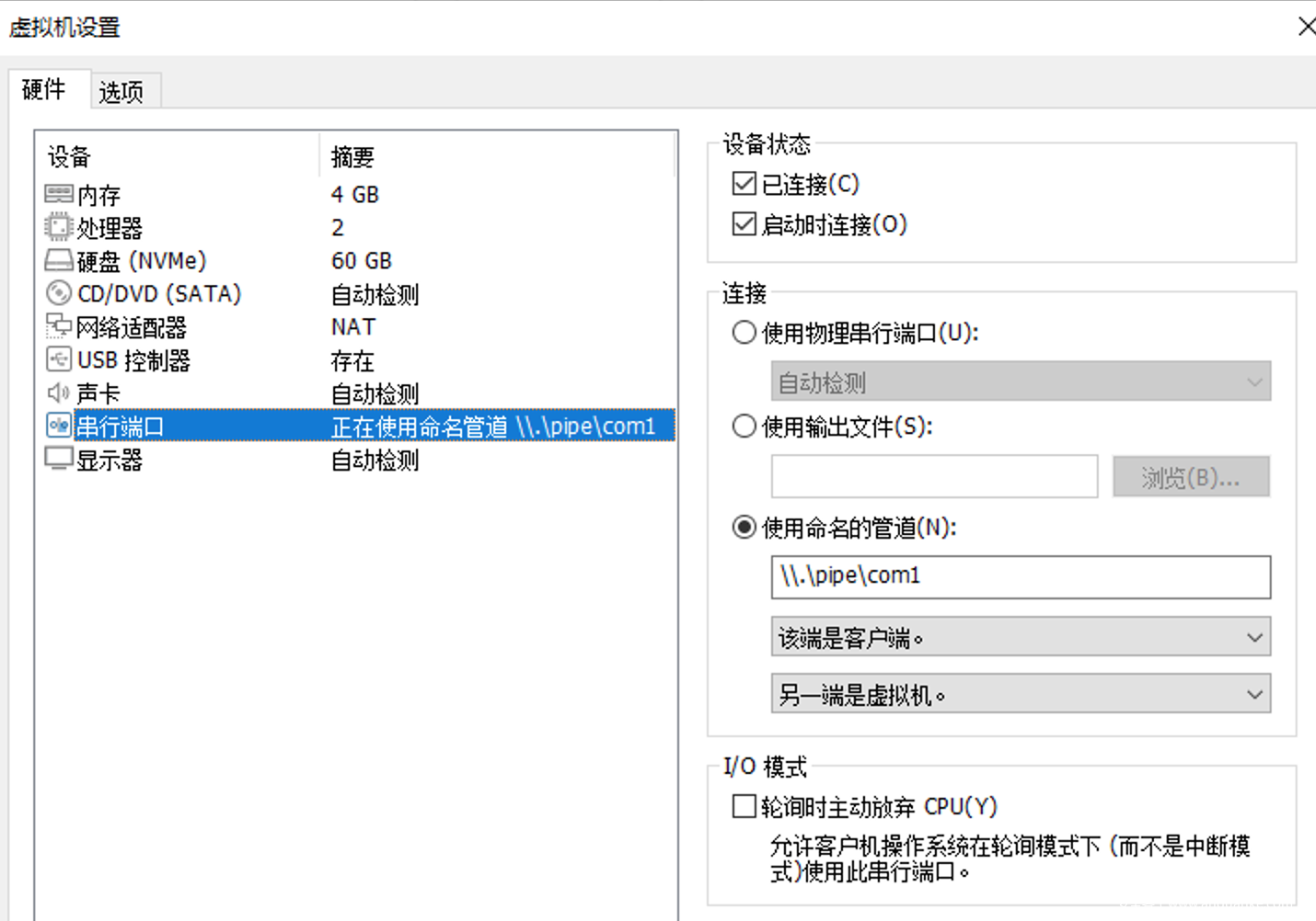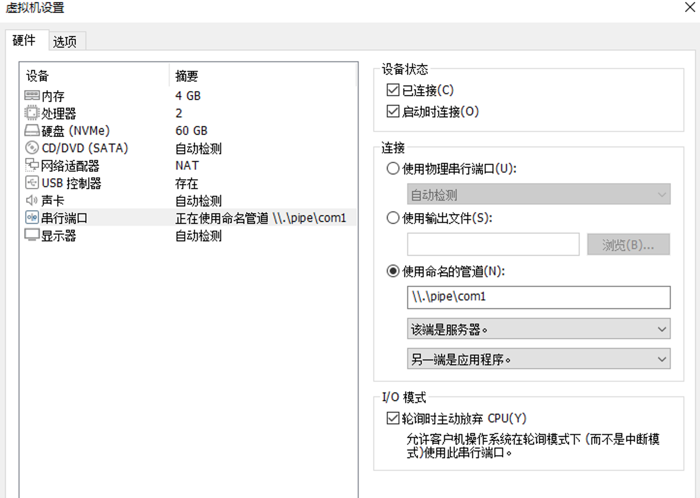 使用 vmware 通过宿主机串口调试虚拟机,这我们再熟悉不过了,在虚拟机串口中配置命名管道 \\.\pipe\com1,设置该端是服务器,设置另一端是应用程序,勾选 轮询时主动放弃CPU,如下: