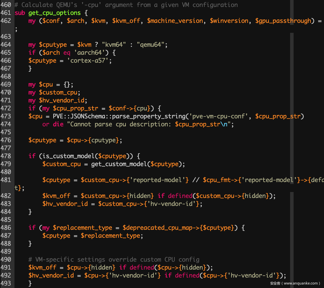 随后在 qemu-server/PVE/QemuServer/CPUConfig.pm#get_cpu_config() 找到 -cpu 参数的生成代码: