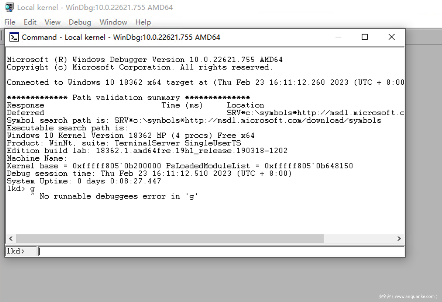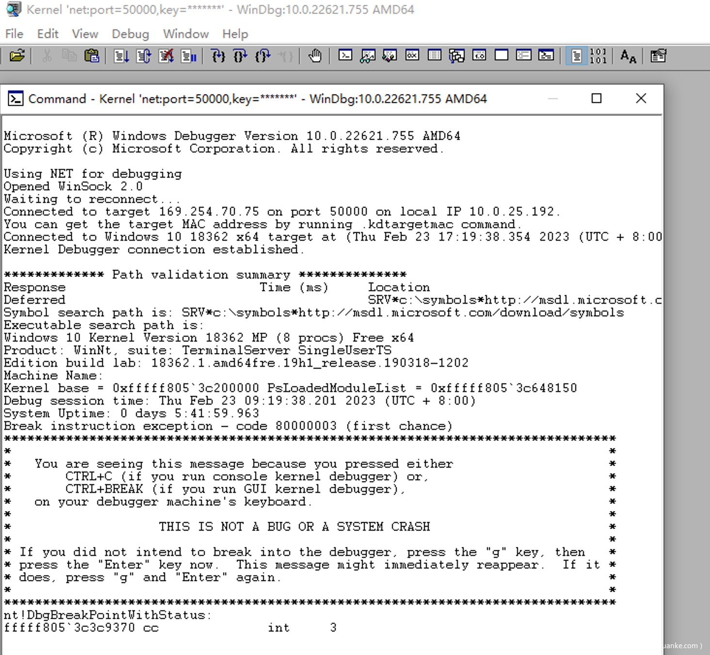 我这里首次连接时 WinDBG 将异常退出,不过重新启动 WinDBG 并设置好参数即可成功连接。