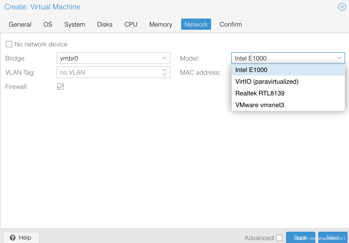 除此之外,在网卡配置阶段需要选择 Intel E1000,如下:
