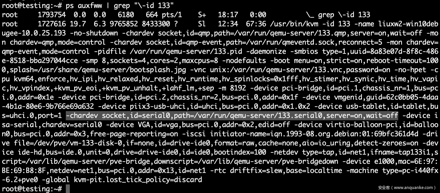 串口设备的参数为 -chardev socket,id=serial0,path=/var/run/qemu-server/133.serial0,server=on,wait=off,同样其参数在 ProxmoxVE 下不能修改。