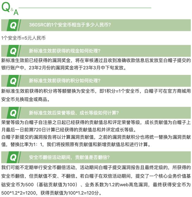 白帽子可每月1~7日在360SRC官网商城使用安全币兑换现金,安全币兑换数量应不低于20个,该月底前付款至银行账户。如遇有节假日或其他特殊事由,发放时间可能延迟。