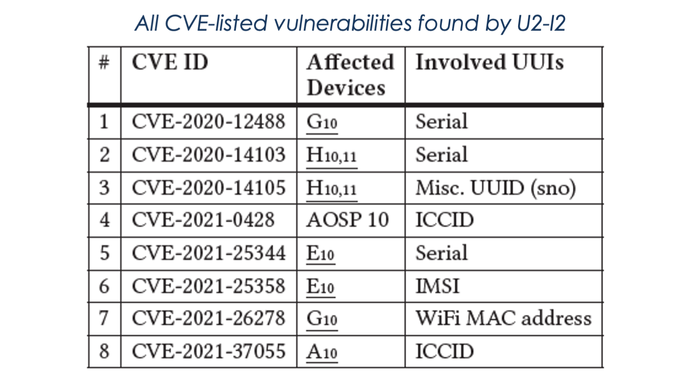 基于上述背景,无恒实验室联合昆士兰大学、新加坡国立大学等科研机构研发了一款名叫U2I2的分析工具,U2I2 不仅评估这六个已知 UUI 的保护情况,还要评估其他以前未报告的 UUI 的保护情况。通过检测可编程接口,非系统应用程序可以在没有所需权限的情况下,恶意通过该接口访问 UUI。无恒实验室对市面上多款最新Android设备进行分析后发现,即使用户的手机安装了最新的Android版本(10.0或更高),一些UUI仍然可以被第三方App轻易获取。最终在13款不同型号的Android设备上共发现了65处系统级别(OS-level)的UUI保护漏洞。