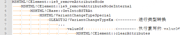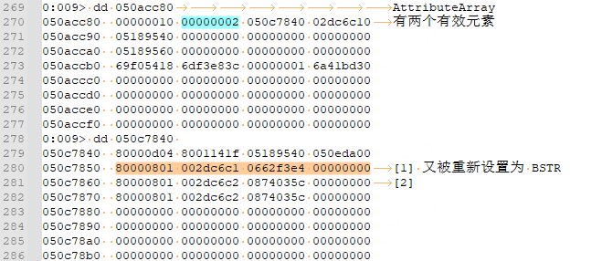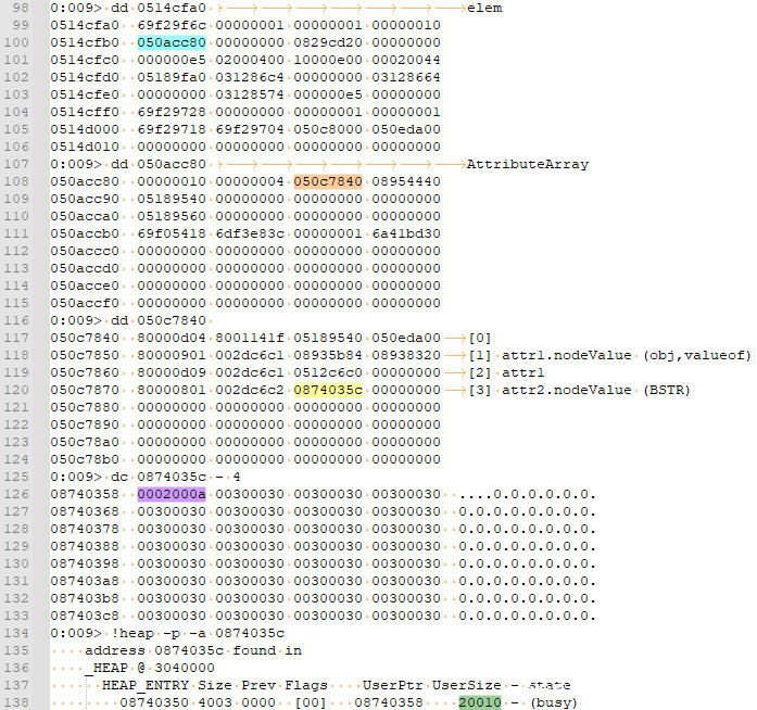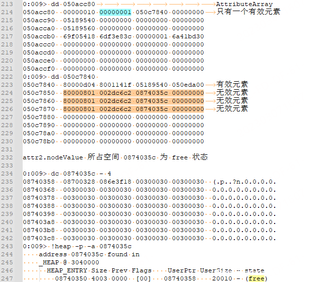 element.clearAttributes() 结束后,AttributeArray 中的无效元素将被其最后一个元素 attr2.nodeValue 覆盖,而 attr2.nodeValue 所占空间也被释放,被释放的缘由是参考文章【1】【3】中提到的极长 BSTR (大于 0x8000)。
