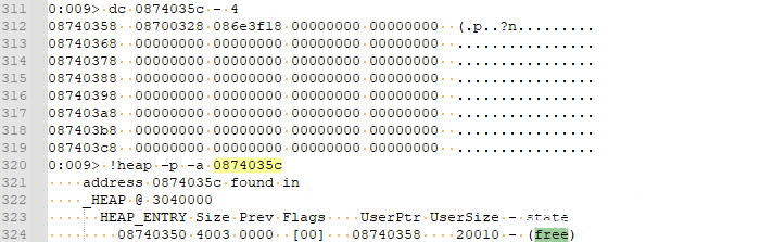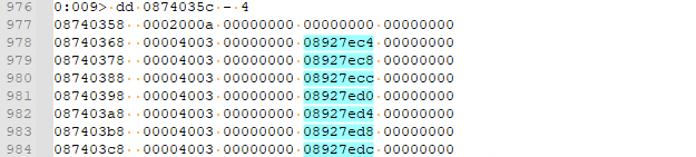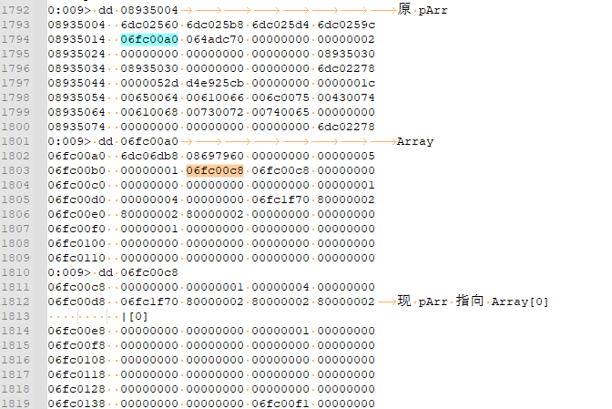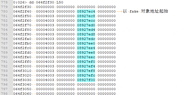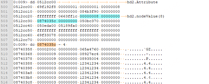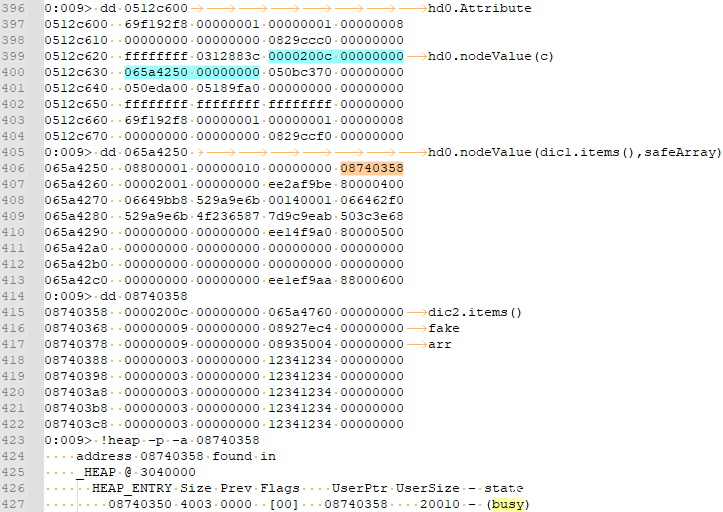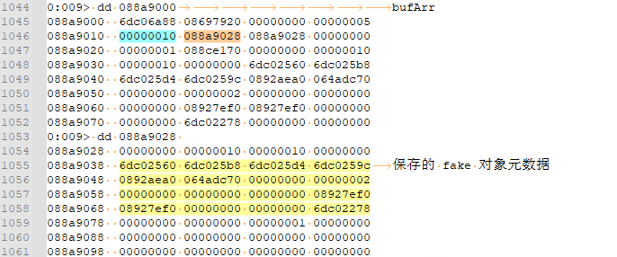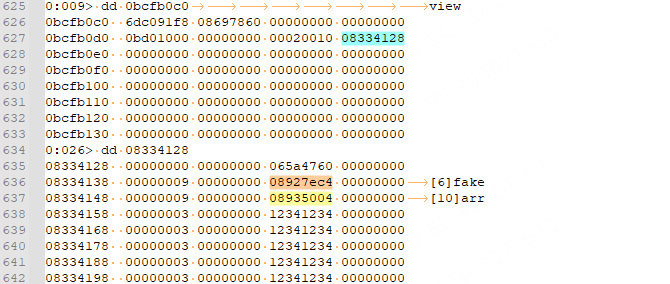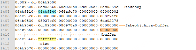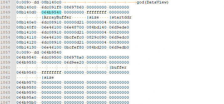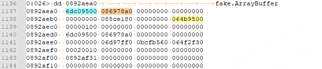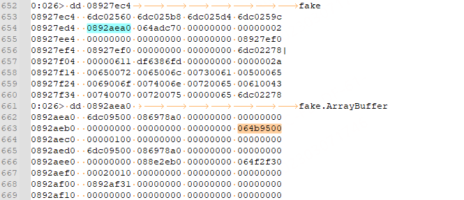 dump 函数以 hd2.nodeValue 为参数,使用 string 对象方法 charCodeAt 获取 hd2.nodeValue(0874035c) 处的数据,然后再以 uint32 视图泄露 fake 对象和 arr 对象的地址。