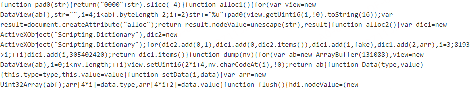 js 解密后的内容除去 shellcode 基本与参考文章【3】中公布的漏洞利用代码一致,只是做了一些精简。