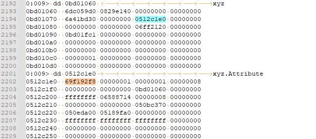 var vft = read(patt, 32)//获得 xyz.Attribute 的虚表地址 vft
