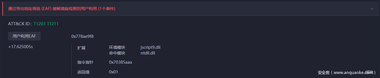沙箱云使用基于导出地址筛选(EAF)缓解措施的漏洞检测准确检测到该样本存在漏洞利用。