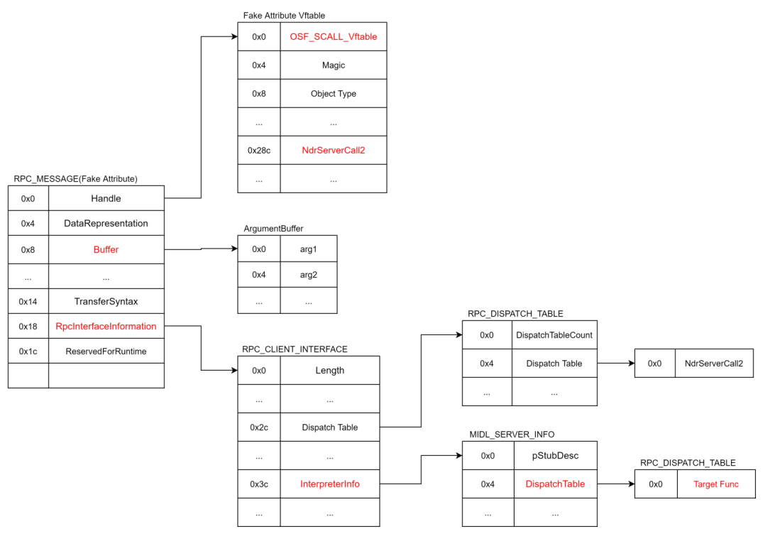 initRpc() 的内容比较庞大这里就不展开说明,这里用一张图说明其构建的 RPC_MESSAGE 主要结构,其中 RPC_MESSAGE 也是伪造的 Attribute,其虚表的 0x28c 处是 xyz.normalize() 执行的 NdrServerCall2 函数的地址。