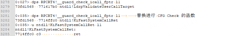 bypass 的方法是将 RPCRT4!__guard_check_icall_fptr 中保存的负责进行 CFG Check 的函数指针由 ntdll!LdrpValidateUserCallTarget 替换为 ntdll!KiFastSystemCallRet。