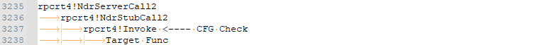 构建完 RPC_MESSAGE 后只需将想要调用的函数的地址放在上图中的 Target Func 处并将函数参数放在 ArgementBuffer 处,然后使用 xyz.normalize() 即可执行目的函数。但是由于 rpcrt4!Invoke 在执行目标函数之前会进行 CFG Check,这样只能调用在 CFGBitmap 中的函数,想调用位于任意位置的 shellcode 就需要 bypass CFG。