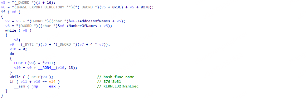 shellcode 通过在 kernel32.dll 模块导出表中查找 WinExec 函数的地址,然后使用其执行了命令行。