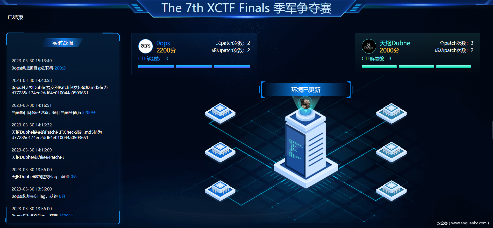 在下半场的季军争夺赛中,天枢Dubhe战队在前三回合持续提交flag得分,以大比分领先;对决进入第四回合,0ops战队一鼓作气追平得分;在两队僵持之时,0ops战队解出最后一道极限竞速赛题,以200分细微优势获得季军。