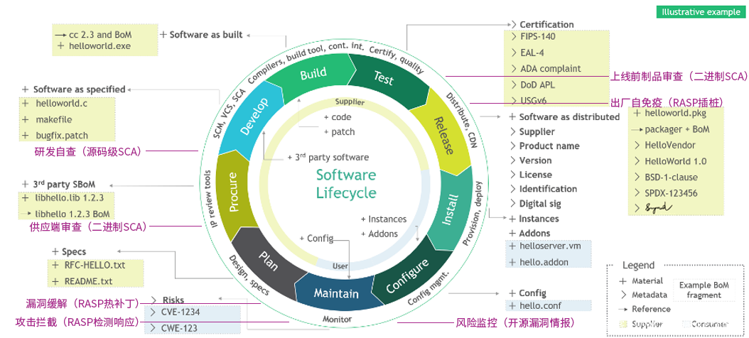 应用软件的安全建设需涵盖软件研发运营的整个周期。在研发阶段,为了保障软件供应链的安全可信,使用SCA(软件成分分析)工具对代码进行检测,并形成软件物料清单(SBOM),盘点代码中引入的第三方组件及这些组件引入的漏洞风险,并围绕SBOM建立安全管理流程。可以设置安全卡点,防止应用带病上线;或至少形成透明化的第三方组件资产及依赖清单,以便安全事件爆发时及时获知自身风险详情。