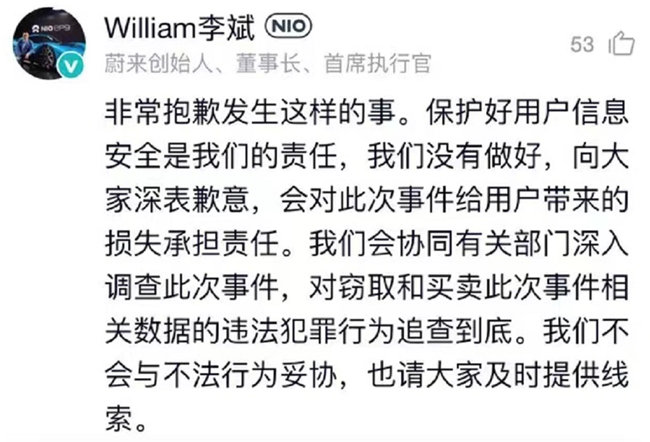 蔚来老板李斌深夜道歉,并郑重承诺,对因本次事件给用户造成的损失承担责任,并将协同执法机关深入调查。